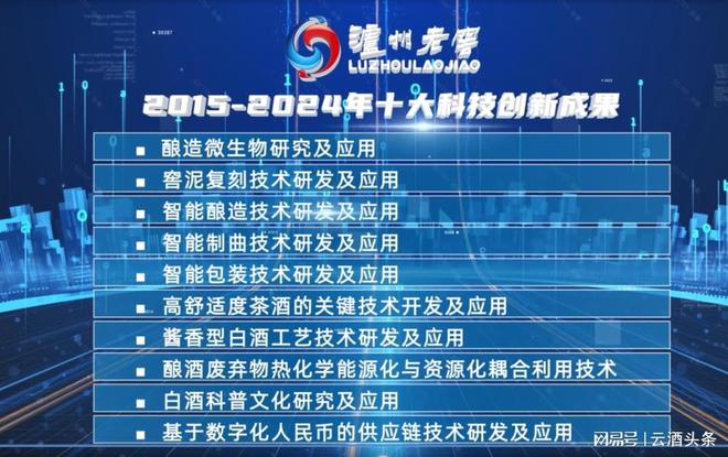 本次大会发布了“2015-2024年泸州老窖十大创新成果”,包括首次探明了酒醅和窖泥体系“分区共酵,协同产香”的微生物发酵演替规律,成功筛选出7株新菌种(属);开发“多菌共酵”窖泥培养技术,实现酿造微生态精准复刻;首次攻克全流程精准酿造技术,创制全套智能酿造装备;首创大曲立体发酵模式,实现了制曲生产全流程智能化;首创高速回转精准定位全自动白酒装盒系统,实现包装和仓储物流自动化,建成了行业首家“灯塔工厂”;首次突破了酿酒废弃物高效干化技术、多级催化热裂解与生物质能量高效转化关键技术,填补了酿酒废弃物热化学处理领域技术空白......