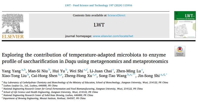 近日,泸州老窖国家固态酿造工程技术研究中心沈才洪主任团队联合四川大学许正宏教授(原江南大学教授)团队合作,在国际食品科技专业期刊《LWT-Food Science and Technology》(IF=6.0,Q1)上发表题为“利用宏基因组学和宏蛋白质组学探究温度适应性微生物群落对大曲糖化酶系的贡献”的研究性论文。江南大学史劲松教授和泸州老窖股份有限公司王松涛正高工为论文通讯作者。泸州老窖品创公司青年员工,江南大学与泸州老窖联合培养博士研究生杨阳为论文第一作者。