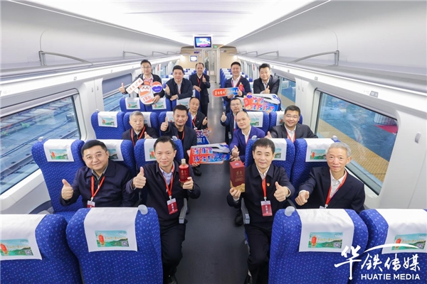 贵州茅台酱香酒营销有限公司党委书记、董事长张旭先生,贵州茅台酱香酒营销有限公司党委委员、副总经理杨秀权先生,贵州茅台酱香系列酒营销顾问团团长王庆云先生,贵州茅台酱香系列酒营销顾问团秘书长李秋水先生,贵州茅台酱香系列酒营销顾问团副团长刘家生先生,华铁传媒集团有限公司媒体开发副总裁张俊逸及茅台酱香系列酒营销顾问团成员共同见证茅台1935高铁冠名列车开行仪式启动。