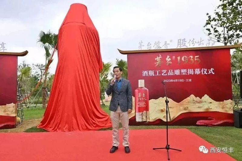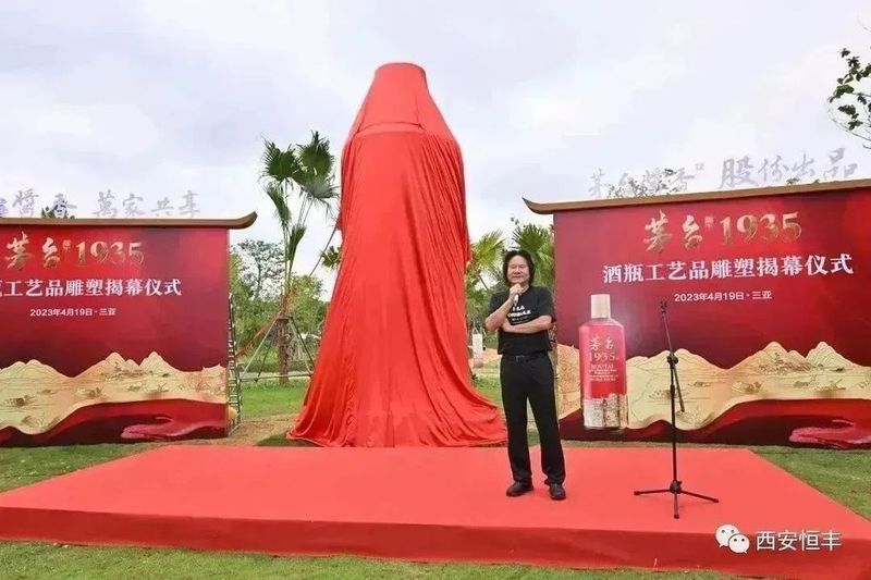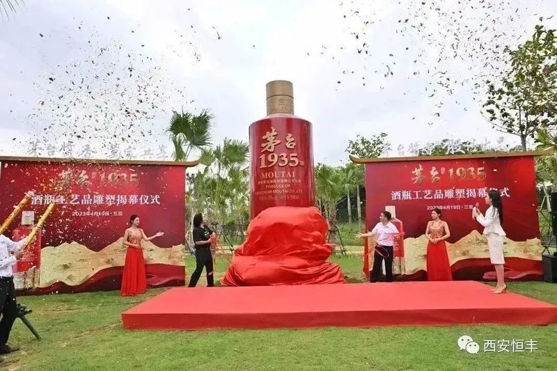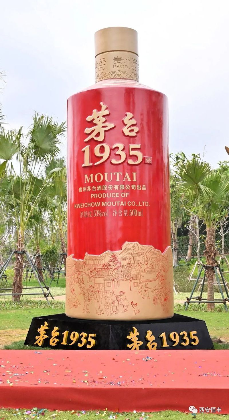茅台1935酒瓶工艺品雕塑高5米,直径1.8米,为玻璃钢材质,由西安知名雕塑制作团队历时近2个月雕刻铸造而成,按照“茅台1935酒”瓶身原型比例放大,精确的再现了茅台1935原瓶的设计艺术和文化底蕴。此雕塑由西安恒丰酒文化有限公司捐建,经过2300多公里的陆海运输,如今坐落于三亚海棠湾茅台度假村茅台1935广场。茅台1935于2022年上市,品质卓越、口感独特、回味悠长。雕塑的揭幕让茅台文化再次与三亚的都市风情因缘际会,继续书写着茅台敬畏历史、铭刻岁月的文化态度和品牌荣光,将为广大茅粉增添又一处旅游休闲的打卡地。