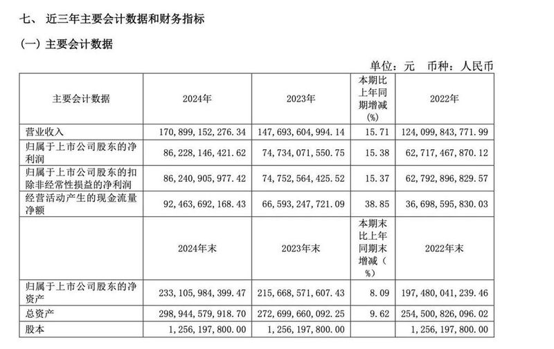 4月2日,贵州茅台发布2024年年报,全年实现营业总收入1741.44亿元,同比增长15.66%;归属于上市公司股东的净利润862.28亿元,同比增长15.38%。这是茅台连续第三年在千亿营收规模上保持15%以上的增速,再次印证其作为中国白酒行业“压舱石”的稳定性。
