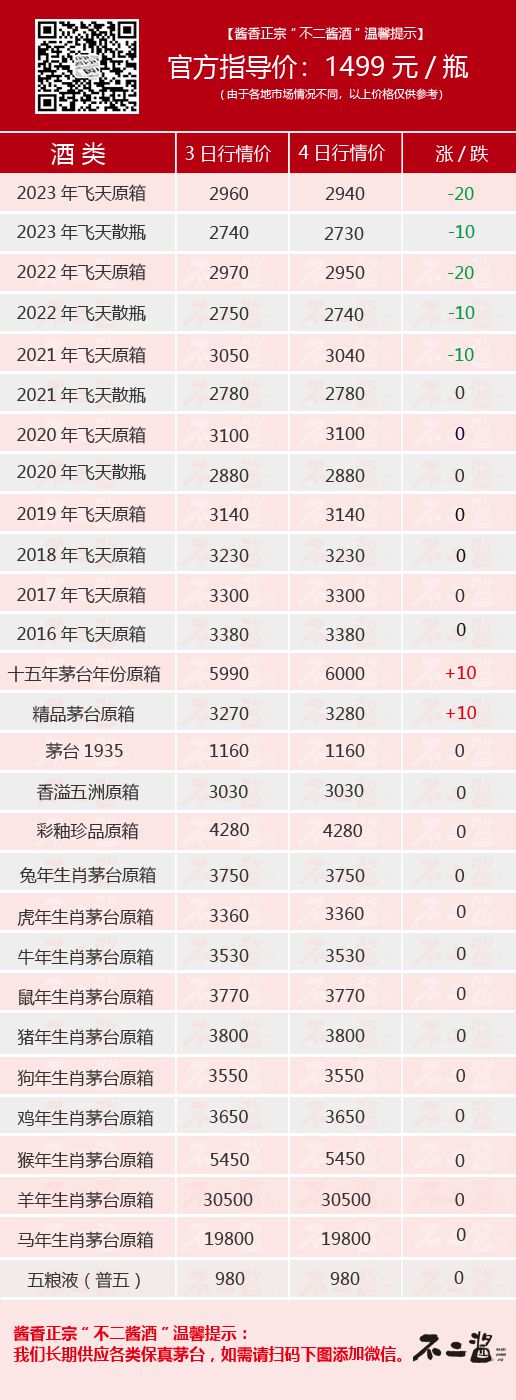 今日茅台酒行情价全览。飞天方面,除2021年散瓶外,2021~2023年原箱及散瓶均有10~20元/瓶的跌幅;生肖方面无动价;其他系列中,十五年,精品茅台涨10元/瓶。