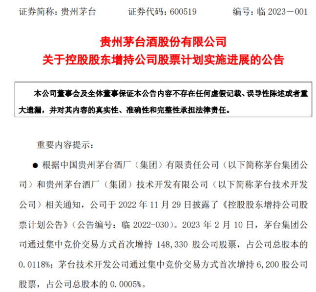 其中,茅台集团公司通过集中竞价交易方式首次增持14.83万股公司股票,茅台技术开发公司通过集中竞价交易方式首次增持0.62万股公司股票