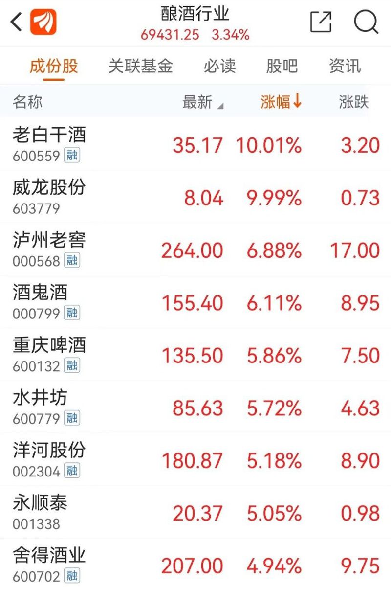 调整了一段时间后,酿酒板块今日突然爆发,老白干酒涨停,泸州老窖,酒鬼酒涨超6%,五粮液涨近4%,贵州茅台涨近3%。