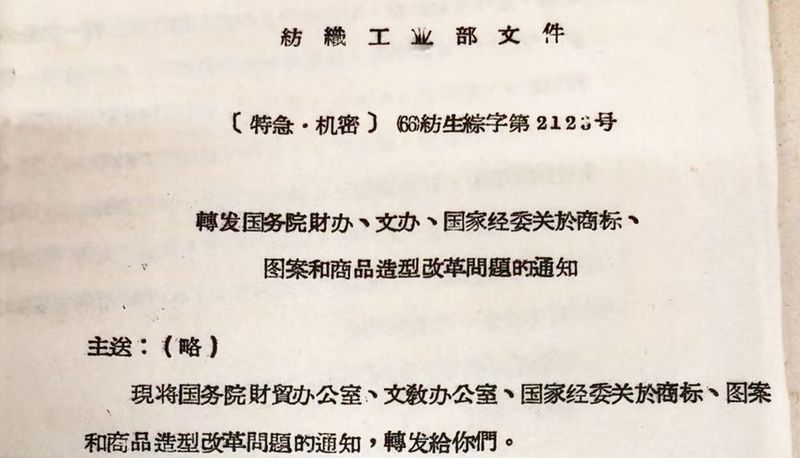 其三:纺织轻工部文件(特急、机密)(68)纺生综字第 2123 号转发国务院财办、文办、国家经委《关于商标、图案和商品造型改革问题的通知》,发文时间是1968年8月26日(3)(略)。