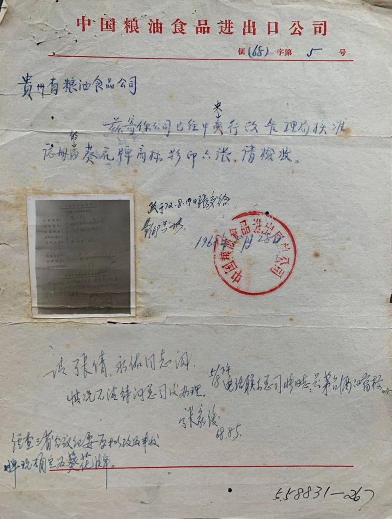 经办人在便函上签注:经查三省会议纪要原拟改丰收牌,现确定为葵花牌,电话联系总公司张同志:是茅台酒的商标,时间是1968年8月5日。