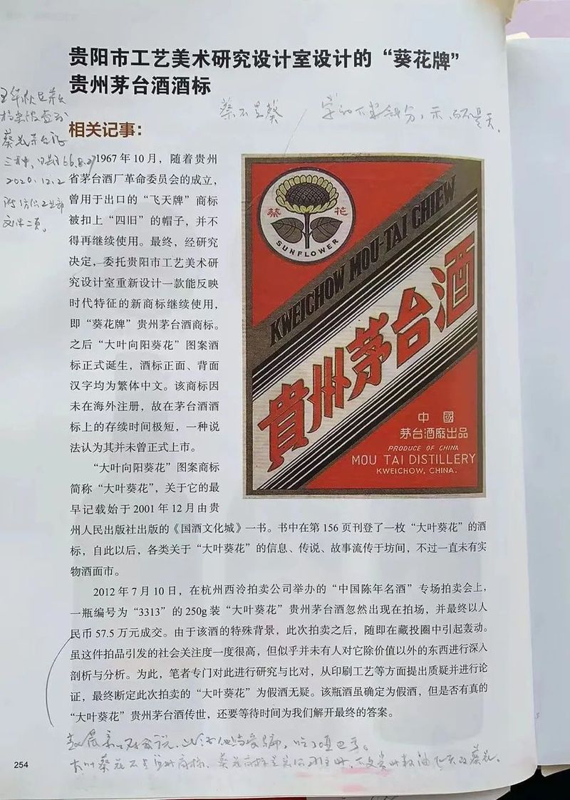 人们不禁要提问,为什么出现“大叶葵花”,而且在出口茅台酒商标上?在茅台中国酒文化城陈列展品和李元胜主编《茅台中国酒文化城》(2020年2月第一版)画册里,以及在收藏家赵晨著《茅台酒收藏投资指南》等专著中均出现 “大叶葵花”,商标名称“葵花”居然错写成“蔡花”,而且酒名的贵字是已不再使用的繁体字。