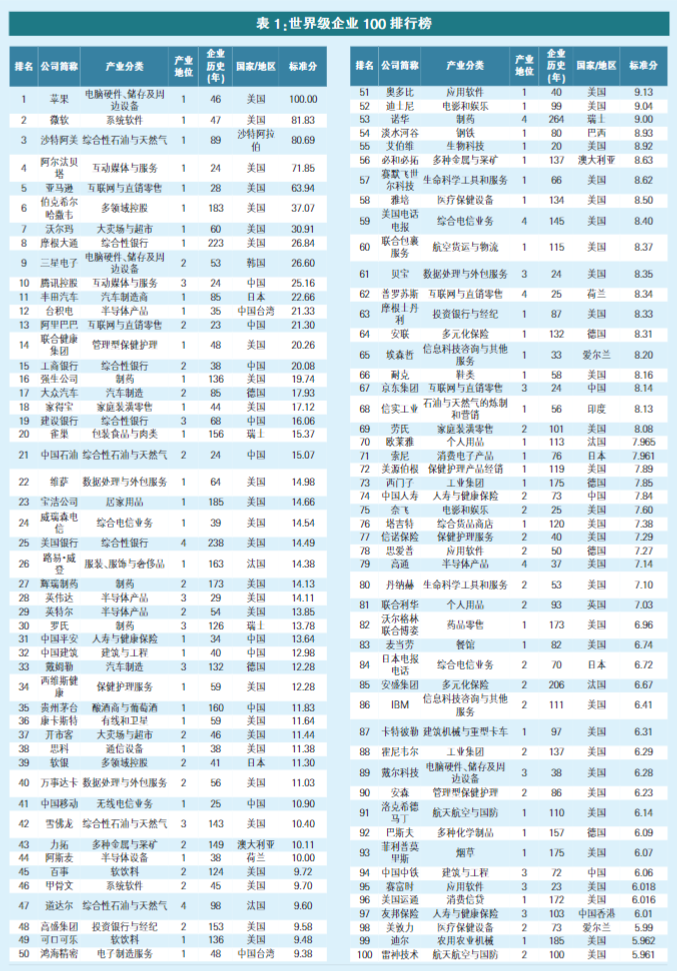 清华大学全球产业研究院首席专家、北京大学教授、南方科技大学兼职教授何志毅在《世界级企业100排行榜的研究解析》中指出,对标世界一流企业的四个要素——产品卓越、品牌卓著、创新领先、治理现代,这份榜单设定了3个前置条件、3个规模指标、3个效率指标、3个社会指标。