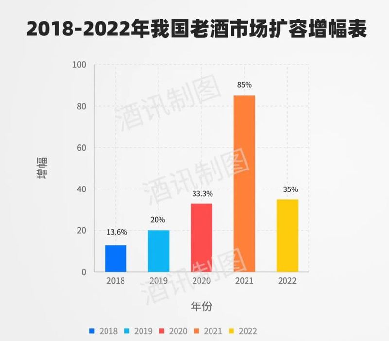 而在白酒投资领域,老酒市场的成长也可看作白酒投资的代表市场。《中国老酒市场指数》显示,老酒市场的扩容正持续加速,近五年增幅分别为13.6%、20%、33.3%、85%、35%。相比之下,中国市场近五年的增速则分别为-7.69%、-5.14%、4.74%、3.89%、3.38%。