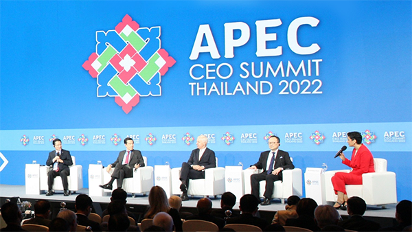 2022年11月17日,丁雄军(左一)在曼谷出席2022年APEC工商领导人峰会,并作英文演讲。