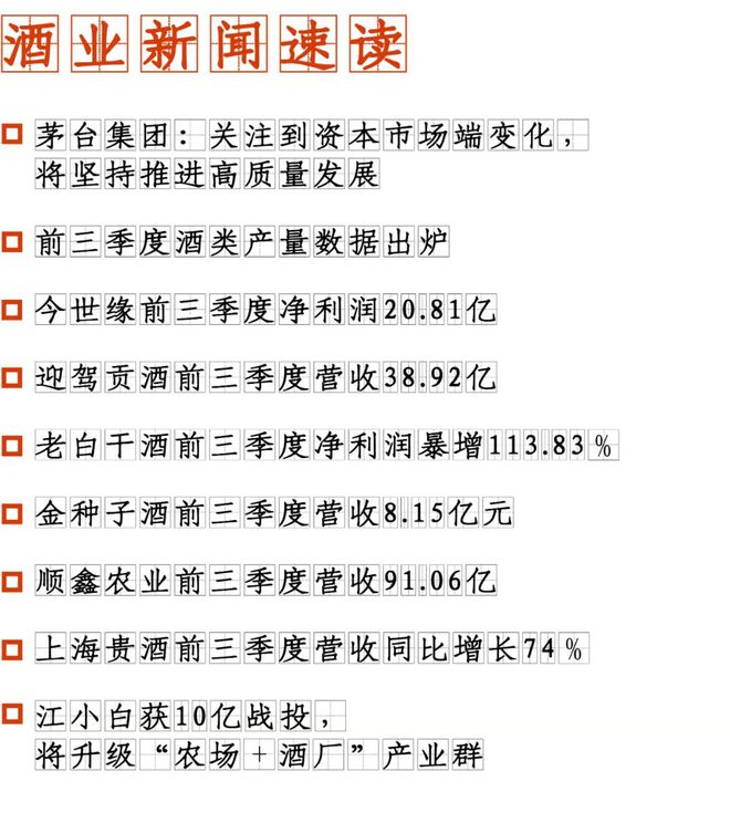 10月27日,国家统计局发布数据。1-9月,全国规模以上白酒企业实现产量487.9万千升,同比下降2.5%;9月产量54万千升,同比下降3.7%。1-9月,啤酒规上企业实现产量2947.9万千升,同比增长1.4%;9月产量310.2万千升,同比增长5.1%。1-9月,葡萄酒规上企业实现产量14.6万千升,同比下降21.9%;9月产量1.9万千升,同比下降13.6%。