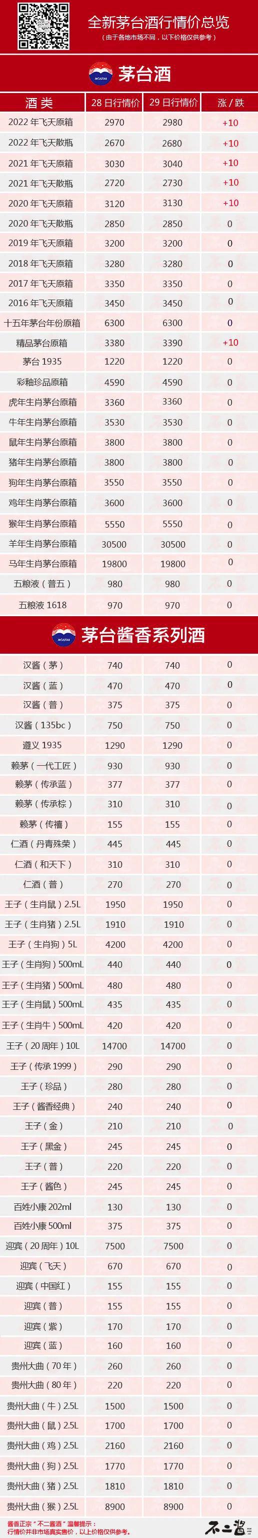 今日茅台酒行情价全览。飞天方面,2021~2022年散瓶、2020~2022年原箱上涨10元/瓶。生肖方面无动价。其他方面,精品茅台原箱上涨10元/瓶。