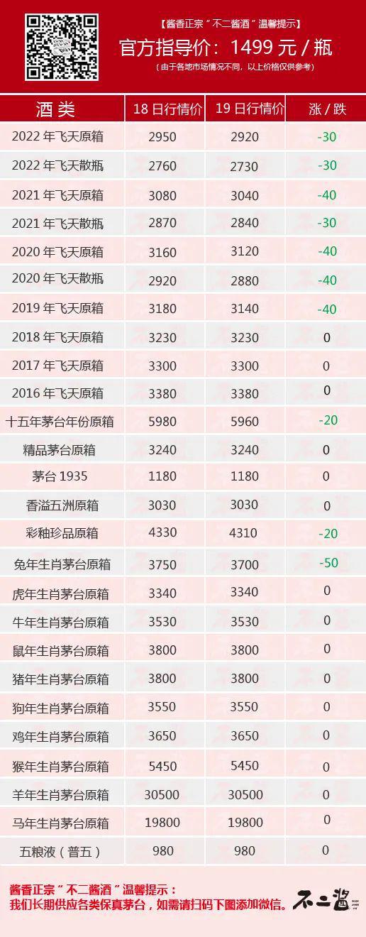 今日茅台酒行情价全览。飞天方面,2019~2022年原箱和散瓶暴跌30~40元/瓶;生肖方面,兔年跌50元/瓶;其他系列中,十五年、彩釉珍品跌20元/瓶。