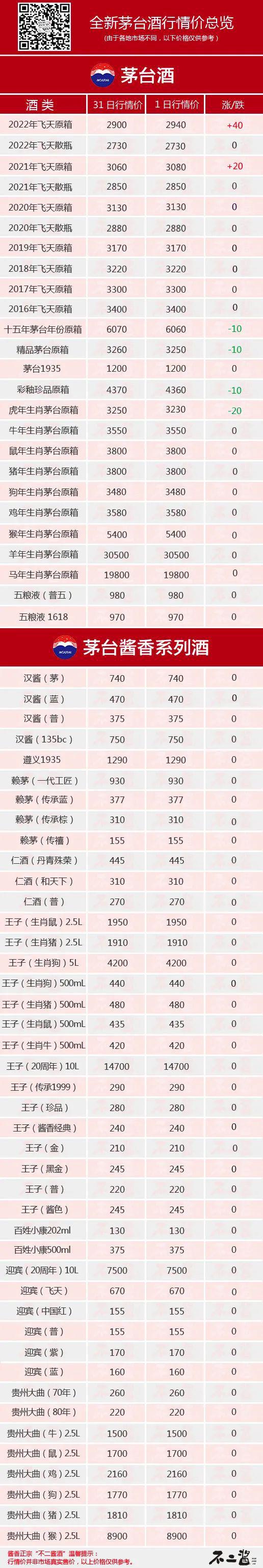 今日茅台酒行情价全览。飞天方面,2021年原箱涨20元/瓶;2022年原箱涨40元/瓶。生肖方面,虎年生肖原箱跌20元/瓶。其他方面,十五年茅台年份原箱、精品茅台原箱、彩釉珍品原箱跌10元/瓶。