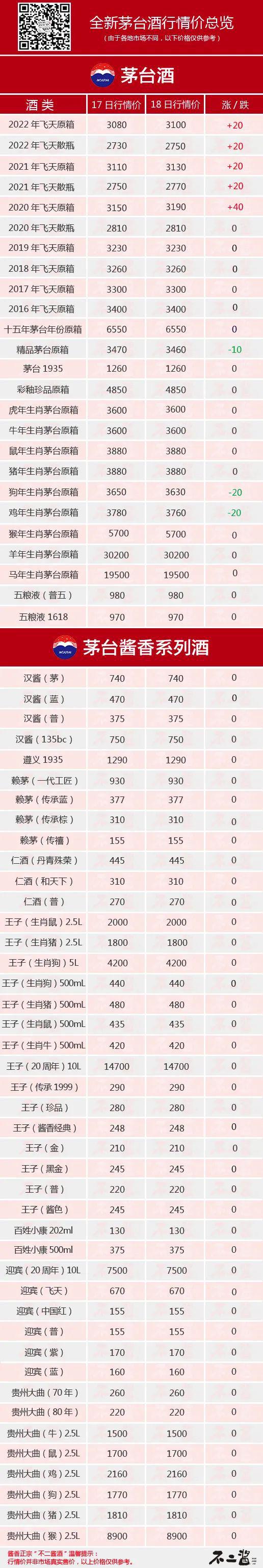 今日茅台酒行情价全览。飞天方面,2021~2022年散瓶、原箱上涨20元/瓶,2020年原箱涨40元/瓶。生肖方面,狗年、鸡年生肖原箱下跌20元/瓶。其他方面无涨跌。