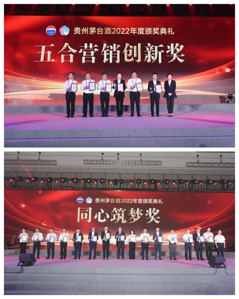 会议还举行了颁奖典礼,对获得茅台酒2022年度“醉美担当奖”“传承创美奖”“家和融美奖”“优秀渠道商奖”“风雨同舟奖”“同心筑梦奖”“五合营销创新奖”“服务之星奖”的获奖经销商代表等进行了表彰和颁奖。