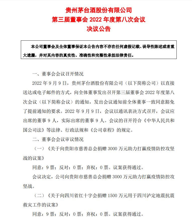 茅台捐赠4500万用贵阳抗疫与泸定抗震救灾2022年9月9日今日(9月9日),茅台发布《贵州茅台酒股份有限公司第三届董事会 2022年度第八次会议决议公告》,公告显示:贵州茅台酒股份有限公司向贵阳市慈善总会捐赠3000万元用于打赢疫情防控攻坚战;同时向四川省红十字会捐赠1500万元用于四川泸定地震抗震救灾。