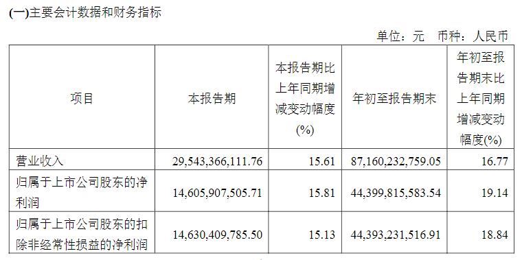 10月16日晚间,贵州茅台正式发布三季度财报。报告披露,前三季度实现营收871.6亿元,同比增长16.77%;归属于上市公司股东净利润443.99亿元,同比增长19.14%;第三季度实现营业总收入295.43亿元,同比增长15.61%左右;归属于上市公司股东净利润146.06亿元,同比增长15.81%。