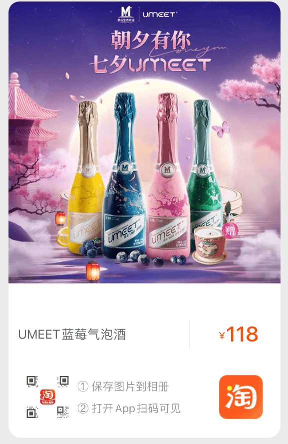 除此之外,8月11日0点,在天猫悠蜜旗舰店UMEET蓝莓气泡酒也同步上新,同时启动了“朝夕有你 七夕UMEET”主题活动,在8月11日00:00至8月14日23:59,购买UMEET蓝莓气泡酒两瓶及以上,即可获得茅台香薰一份。为消费者的七夕点燃甜蜜氛围,进行浪漫加成。