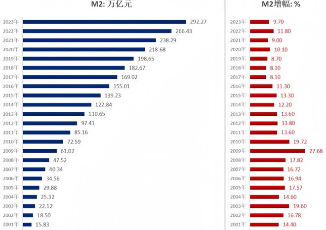 所有的供给都是在对应的需求下才表现出有效性,供需失衡必会酿成恶果。2023年的茅台相比于2001年的五粮液,利润占比11倍差额的背后说明,2023年茅台的社会价值远高于2001年五粮液的社会价值,22年期间,中国经历了一个长周期的货币增发过程,中国社交价值的货币定价也水涨船高,给了茅台一个高于五粮液11倍的“估值”。下面是中国2001年到2023年M2的表现: