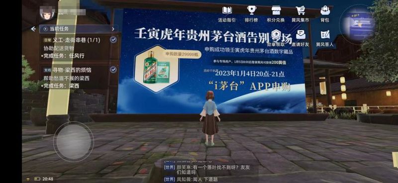 距离玉兔·瑞盈贵州茅台生肖酒发布会还有不到24小时,在茅台镇的“茅酒之源”广场,工作人员正在忙着布置会场。在另一个时空——“巽风”数字世界里,数万用户也正在做积极任务攒巽值,以换取巽风世界“兔茅”发布会的门票。