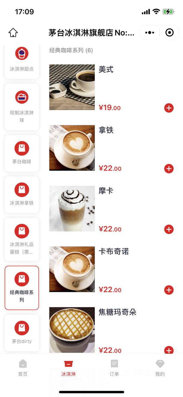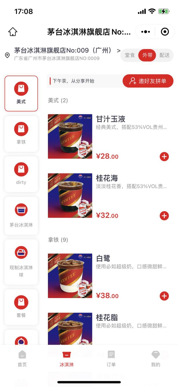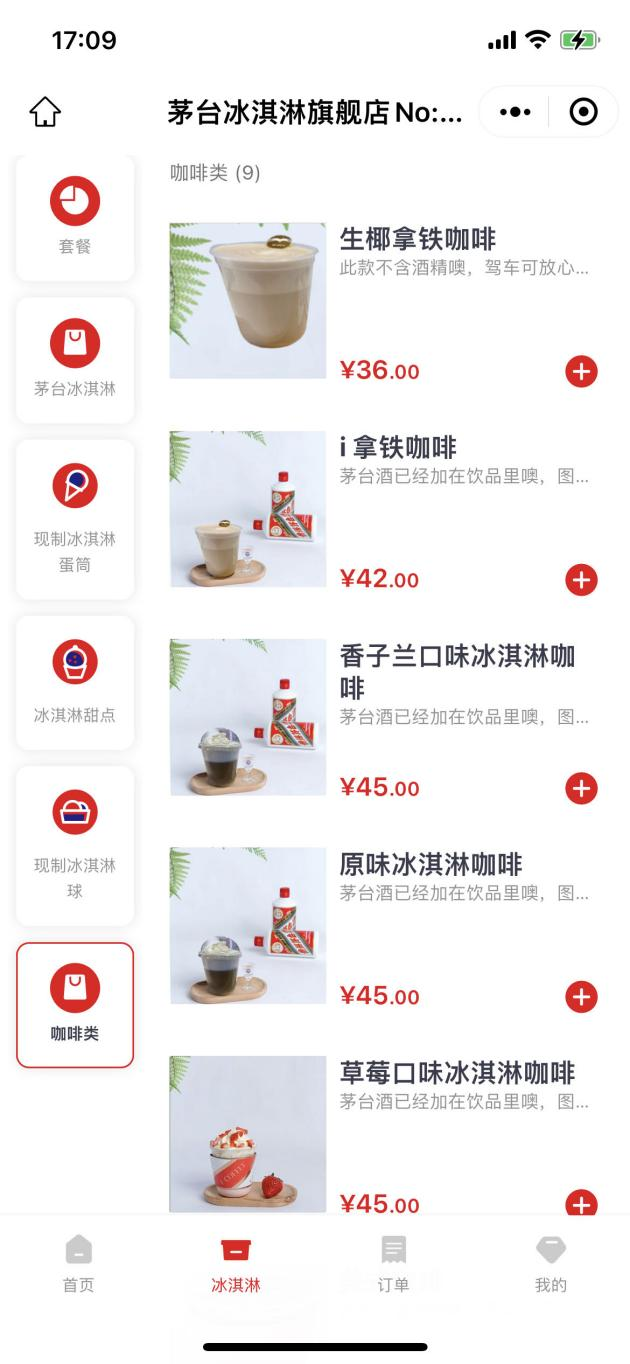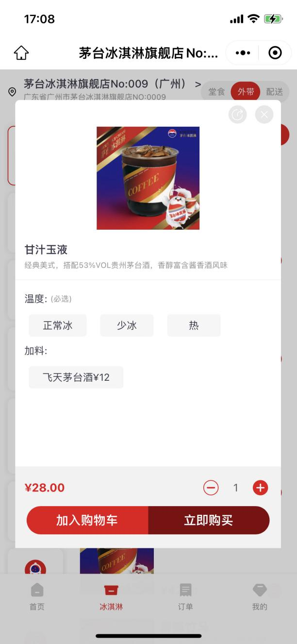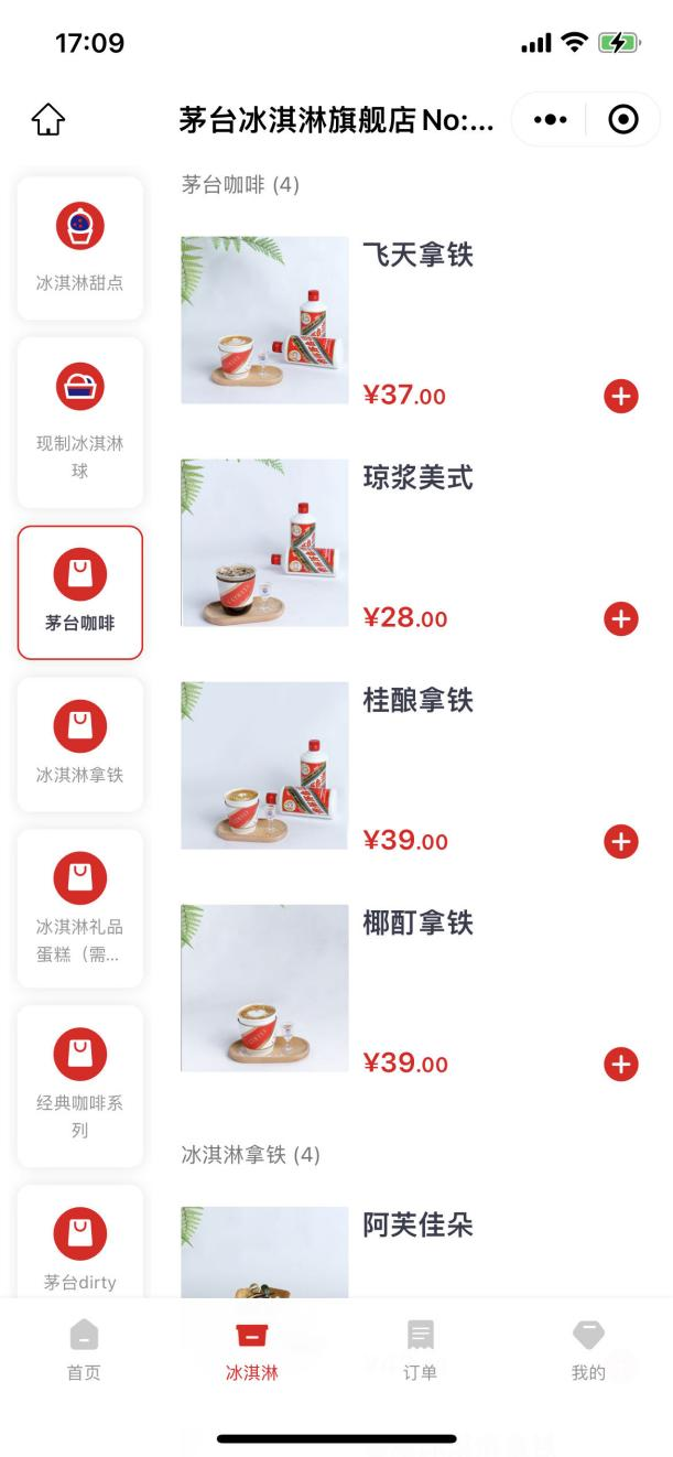 茅台冰淇淋旗舰店No:009(广州)店点单小程序页面