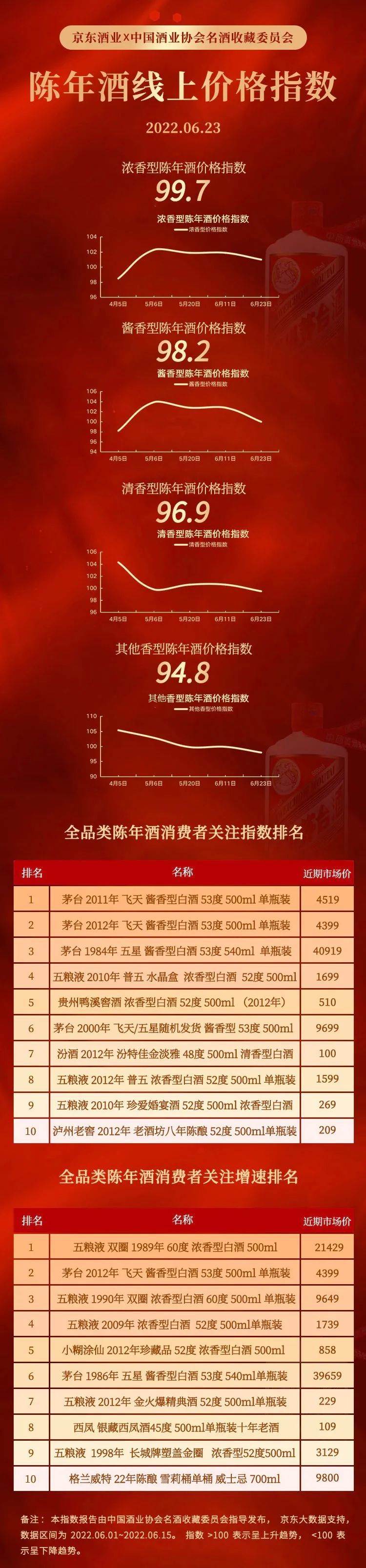 随着陈年酒市场逐步规范和扩大,大家也越来越关注陈年酒。近期,中国酒业协会名酒收藏委员会联合京东酒业,以京东大数据资源为技术支持,并加以筛选分析,形成如下陈年酒价值指数及关注指数报告。