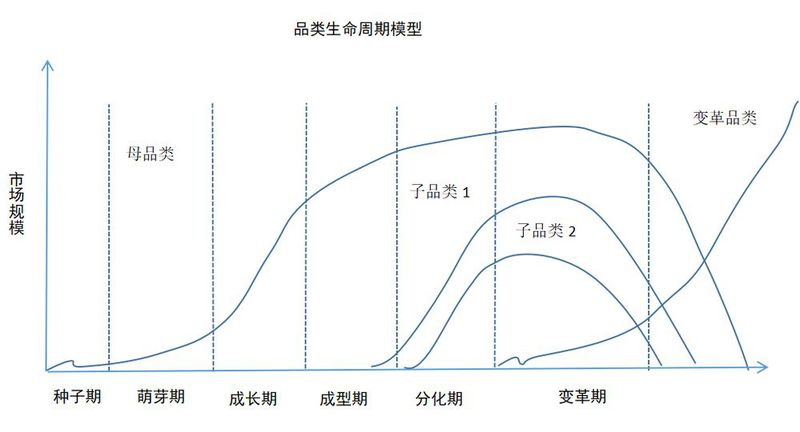品类生命成长主要分为六个时期:种子期、萌芽期、成长期、成型期、分化期、变革期(见下图所示)。