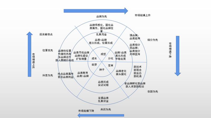 品类分化期:此时品类已经非常成熟,品类寡头品牌的格局已经形成,品牌规模差距急剧放大,传播门槛大幅增高,增速降低。此时主要的经营战略机遇是品类延伸扩大规模和品类细分开辟新蓝海两个方向。