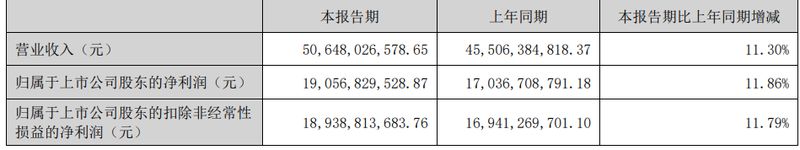 8月29日,五粮液发布了2024上半年业绩报告。报告显示,上半年五粮液实现营业收入506.48亿元,同比增长11.30%;归母净利润190.57亿元,同比增长11.86%。