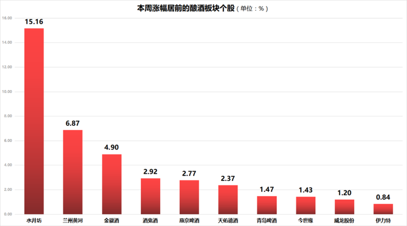 临近年底,酿酒板块在连续三周超20%上涨之后,本周小幅下跌0.94%,指数报收7481.64点,从年初至今下跌12.01%。虽然本周指数小幅调整,但不乏水井坊、兰州黄河、金徽酒等个股涨幅居前,分别上涨15.16%、6.87%和4.9%。白酒头部企业古井贡酒和啤酒龙头青岛啤酒,今年股价表现抢眼,目前股价在高位区有望成为对应板块最先创出历史新高的个股。