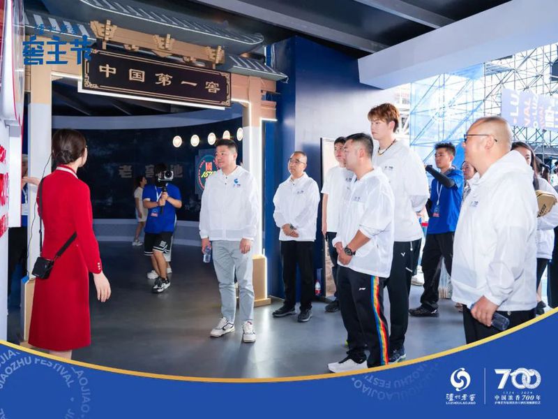 羽毛球世界冠军刘雨辰、2000年悉尼奥运会男乒双打冠军阎森与泸州老窖销售有限公司党委书记、总经理张彪共同参观活态双国宝馆
