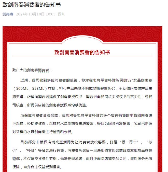 今日,剑南春发出《致剑南春消费者的告知书》。告知书提及收到多位消费者的反馈,称对在电商平台补贴购买的52°水晶剑南春(500ML、558ML)存疑,担心产品来源不明或涉嫌假冒伪劣,主动询问店铺产品来源渠道,店铺向消费者提供了剑南春授权书,消费者向剑南春核实授权书的真实性。经剑南春核查,所提供店铺的剑南春授权书均系伪造。