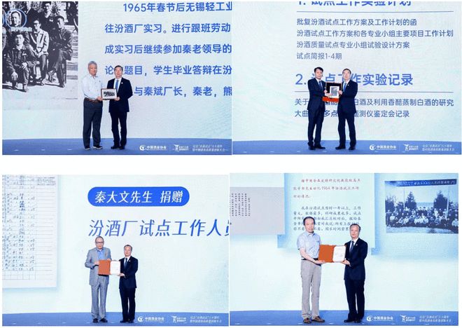 在今天的纪念活动中,中国食品发酵工业研究院、江南大学、秦含章先生和熊子书先生的家属分别向大会捐赠了一系列十分珍贵的“汾酒试点”文物资料;“2024汾酒试点”项目专家团宣告成立,中国酒业协会理事长宋书玉和山西杏花村汾酒集团有限责任公司党委书记、董事长袁清茂,共同向专家团成员颁发了聘书;大会还特聘周和平、纪正昆、阎晓宏、曹健林、王庚年、李文儒、石碧、李景虹、杨维才、路福平、郭新光、徐岩、张五九、高小林、白逢彦等领导和学者为“中国白酒产业链科创文创专家”。在本次盛大纪念活动现场,还有两个引人注目的靓丽环节:“汾酒试点”60周年纪念酒隆重发布,“2024汾酒试点”项目正式启动。