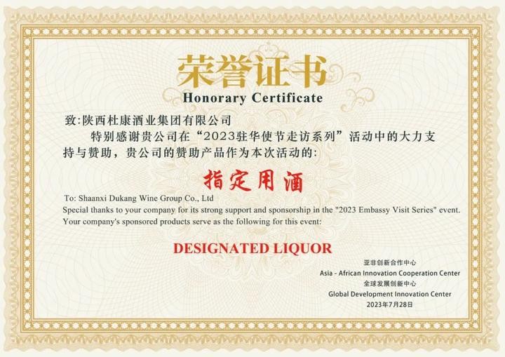 美酒社交,是全世界共通的语言。在活动午宴上,各国外交官、知名企业家们一同入座,品美酒、吃美食,一起领略全球文化碰撞的火花。白水杜康十三朝-酒海陈藏精彩亮相本次活动现场,精致的秦汉时期宫廷酒器造型以及醇厚甘爽的美味享受,引得众多外交官与嘉宾驻足品尝,纷纷对其赞不绝口!白水杜康十三朝-酒海陈藏的出现,充当起沟通桥梁和情感纽带,以世界语言诉说中国千年故事。值得一提的是,组委会还向陕西杜康酒业授予官方指定用酒荣誉证书,给予品牌最大的认可和欣赏。