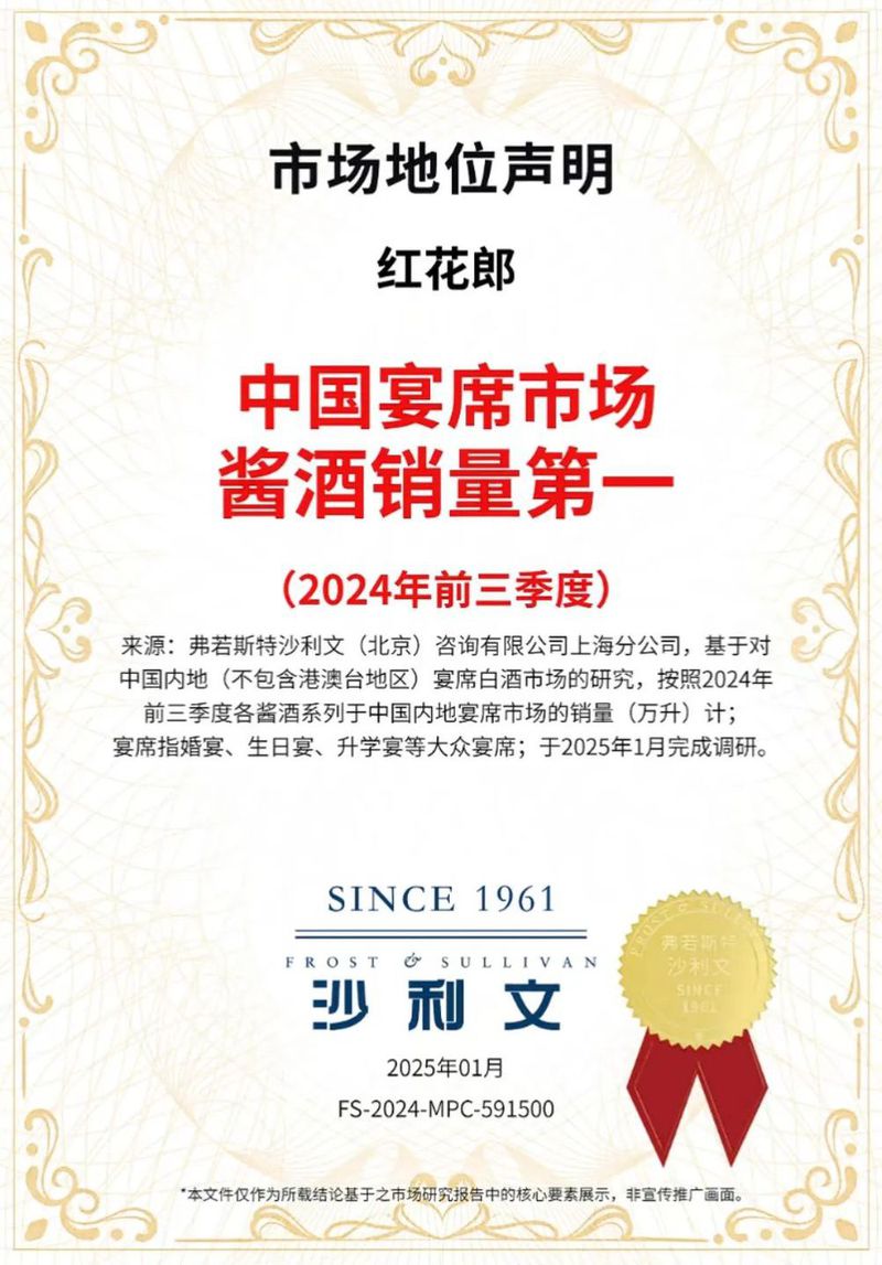作为一种阶段性成果和价值认可,全球领先增长咨询公司弗若斯特沙利文发布红花郎“中国宴席市场酱酒销量第一”认证,以更直观的方式,体现这支明星单品的行业地位,与当前红花郎的市场热销形成了呼应之势。