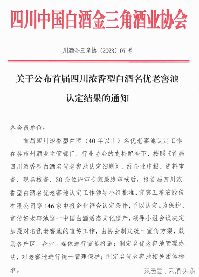 6月29日,四川中国白酒金三角协会发布《关于公布首届四川浓香型白酒名优老窖池认定结果的通知》,五粮液、舍得酒业、水井坊等146家申报企业符合认定条件。