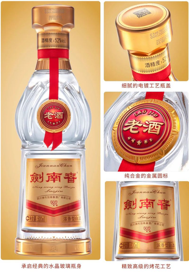 以八大名酒的品牌价值,1500年的品牌底蕴,添加了更多、更长时间坛储的老酒,由剑南春集团酿酒大师精心调配而成的剑南春老酒,可谓“赢在起跑线上”。