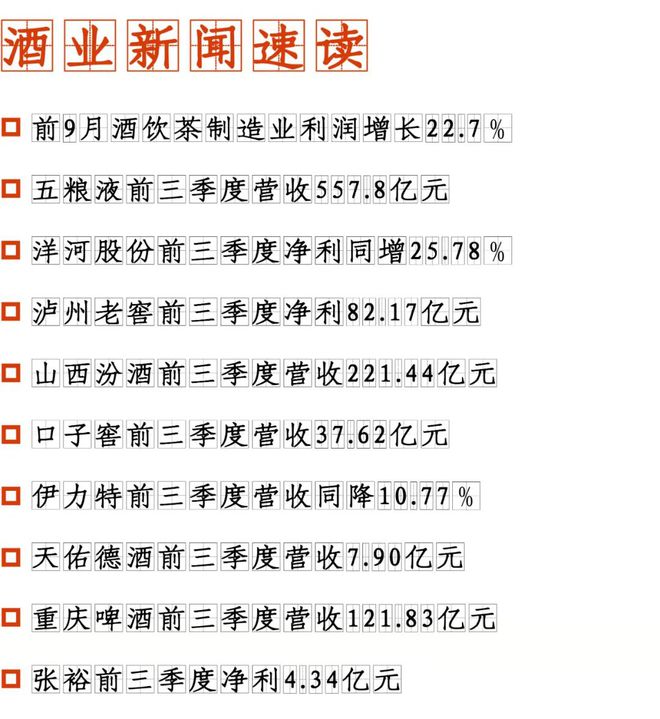 10月27日,国家统计局发布数据,1-9月全国规模以上工业企业实现利润总额62441.8亿元,同比下降2.3%。其中酒、饮料和精制茶制造业实现营业收入12842.1亿元,同比增长7.4%;实现利润总额2488.5亿元,同比增长22.7%。