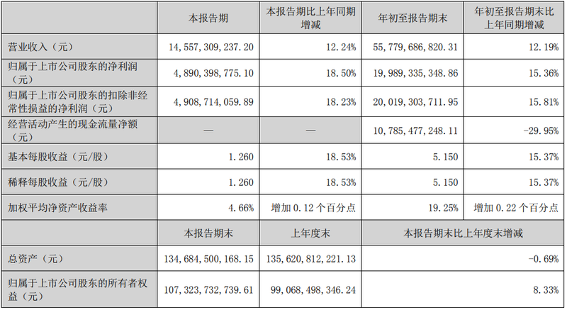 10月27日,五粮液股份公司发布前三季度业绩报告,今年1-9月,五粮液实现营业收入557.80亿元,同比增长12.19%;归属上市公司股东的净利润199.89亿元,同比增长15.36%。
