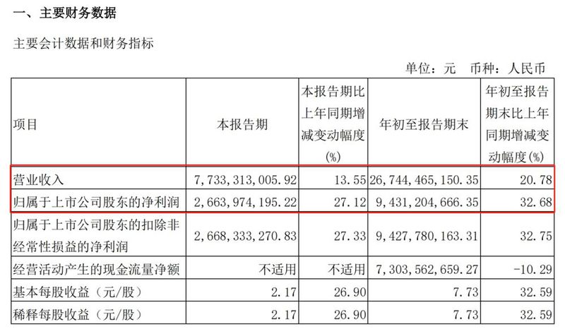 10月26日晚间,山西汾酒(600809.SH)披露2023年三季度报告,报告显示:2023年前三季度公司实现营业收入267.44亿元,同比增长20.78%;归属于上市公司股东的净利润94.31亿元,同比增长32.68%。