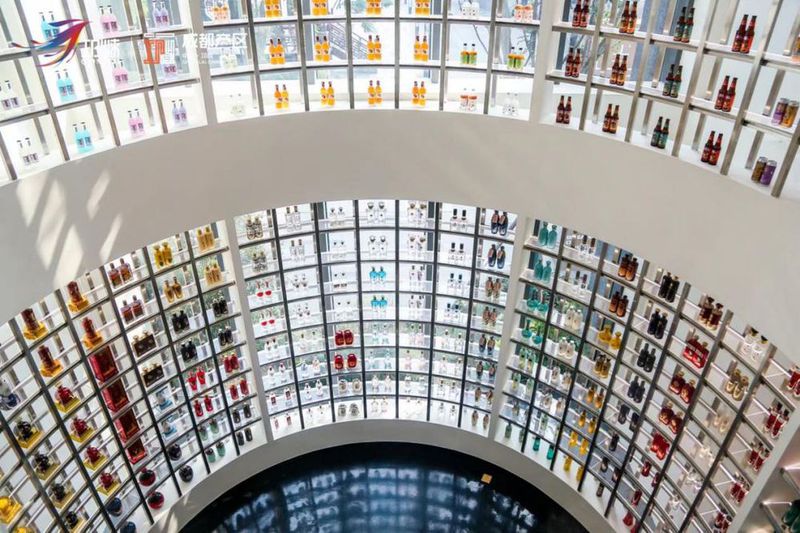 一进门的邛酒森林,从底层直通穹顶,光线透过不同颜色形态的酒瓶折射出星星点点的光斑,让人仿佛在酒的森林里徜徉探索。细看不同的酒体形态,犹如一个个独特特色的巴蜀文化符号,与坐拥千年文化底蕴的文脉坊交相辉映。