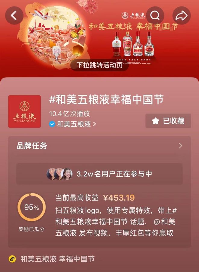 活动期间,抖音用户搜索#和美五粮液 幸福中国节,点击“立即参与”,使用五粮液“和美五粮液”专属贴纸真人出镜,再带上话题发布视频并@指定账号“和美五粮液”,便有机会瓜分丰厚现金红包。