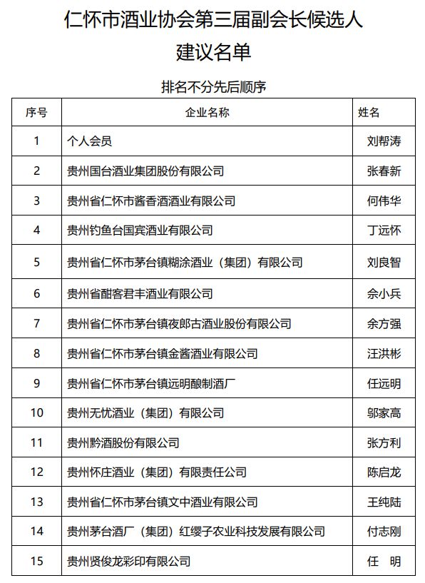 当天上午,经过无记名投票选举,仁怀市酒业协会第三届理事会成员诞生: