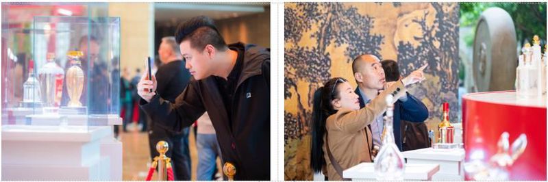 在赓续传承板块,五粮液借酒店中式大堂营造千年酒文化沉浸式氛围感,以川西古建筑风格打造嘉宾签到处,风格鲜明,不拘一格,墙上循环播放的五粮液品牌宣传片,深入人心;由九龙坛、501五粮液、经典五粮液、第八代五粮液以及和美中国、五福熊猫等重磅产品合力打造的产品展台位于酒店大堂C位中央,如众星捧月般夺人眼球;不断旋转的展台,确保观展者可以从不同角度欣赏产品,提升产品观赏性;四周环绕的展柜,展示着从第一代到第八代五粮液,不断赓续传承的品牌发展历程,娓娓道来每一款时代经典背后浓墨重彩的五粮液发展篇章。