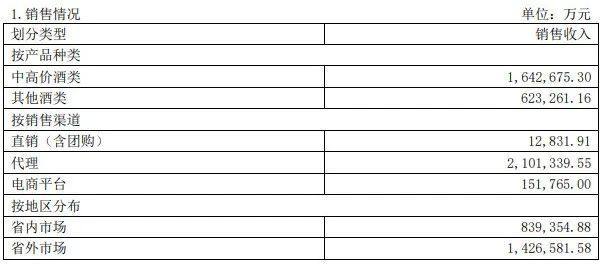 以销售渠道来看,目前,山西汾酒主要分为直销(含团购)、代理和电商平台三种销售模式,分别实现销售收入1.28亿元、210.13亿元和15.18亿元。