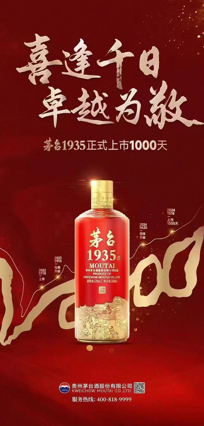 1935年,茅台前身烧房展品在“西南各省物资展览会”上荣获特等奖,彼时谁也不曾想到,“1935”会在87年后还有其他特殊意义。为纪念这段特别的历史,2022年1月18日,茅台1935于茅台中国酒文化城面世。今天,恰是其上市1000天的特别日子。