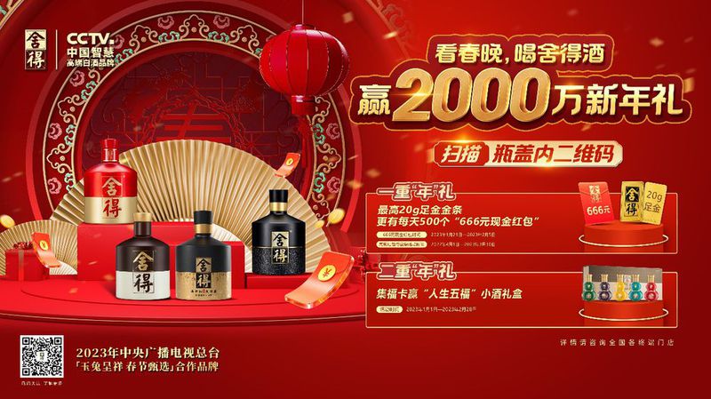 在线下端,春节期间舍得酒重磅推出“扫描瓶盖内二维码,赢2000万新年礼”活动,消费者购买任意活动产品,一次扫码可获得“双重豪礼”:一重豪礼,最高20g足金金条,除夕(1月21日)至元宵(2月5日)16天期间,每天500个“666元现金红包”等你来抢;二重豪礼,集福卡赢“人生五福”小酒礼盒。