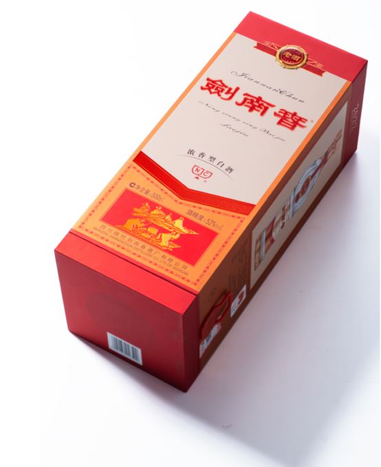 包装上,剑南春老酒的设计灵感来源于上世纪90年代经典的黄盖莲花瓶剑南春,在此基础上进行了升级设计。瓶盖由原来的黄铝盖变为塑料电镀工艺。盖桶沿袭红色绸带设计,圆形瓶标由原来的工业纸标升级为合金工艺。瓶身整体进行了调整优化,对经典款莲花进行了再设计。瓶标升级成工艺更加精致的烤花工艺,醒目的红色大“V”象征向着成功胜利锐意进取。瓶底“天干地支”中的天干和刻度,凸显产品生产的年份,传达给消费者“老酒”的窖藏痕迹,与时间同乘,与岁月并行的故事。