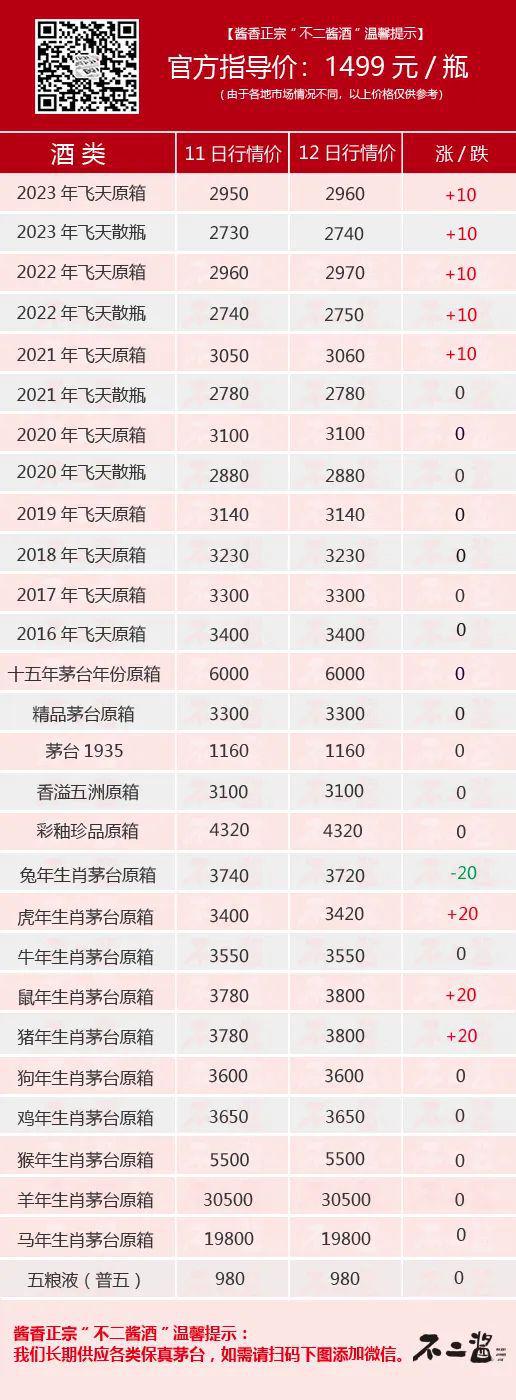 今日茅台酒行情价一览。飞天方面,2021~2023年原箱和散瓶涨10元/瓶。生肖方面,兔年跌20元/瓶;虎年、鼠年、猪年涨20元/瓶。其他系列中无动价。